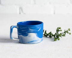 These mugs were modeled after a beloved tin camping mug with a compact, sturdy shape. The Cloudware clay transforms an everyday sort of mug into something new and different. Cloudware is our proprietary blue and white clay, designed to echo historic Wedgwood Jasperware and mimic the blue, cloud- streaked sky of a North Carolina afternoon. Every piece captures a unique moment frozen in time-- no two are ever alike, just like the clouds on a summer day or the swirls and veins of marble.