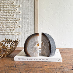 Illuminate your bookshelf with these stunning Natural Agate Druzy Bookends. Crafted from natural Brazilian agate, one bookend boasts a sparkling druzy center. The perfect way to organize your favorite reads and add a touch of natural beauty to your space.