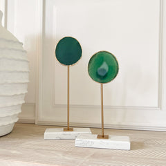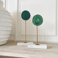 Experience the captivating beauty of our Agate Green Eye Sculpture. Hand crafted in Portugal, these beautiful pieces feature a translucent green agate slice with gilded edge displayed on a marble and brass stand. Their mesmerizing green hues are sure to captivate and bring a sense of tranquility to your space.