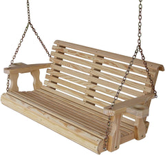 Expertly crafted by Amish artisans, our Amish Casual Roll Back Porch Swing is built for comfort and durability. Made from pressure treated pine, its rollback design and lumbar support ensure relaxation. With quality construction and rust-resistant hardware, this swing is built to last. Minor assembly required.