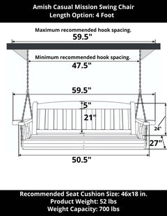 Expertly crafted by Amish artisans, the Amish Casual Mission Heavy Duty Porch swing is made from #1 kiln-dried pressure treated pine for long-lasting durability. The classic mission backrest design and rolled, contoured seat ensure comfortable seating. With quality construction and rust-resistant hardware, this swing is a timeless addition to any porch. Made in the USA. Assembly required. Hanging chains included.