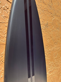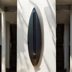 Modern black beach decor with hand crafted decorative wood surfboard art. We call this design "Black Tides". Matte black deck with 2 high gloss black stringers