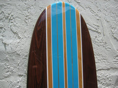 Surf board wall art designed with a beautiful ocean blue airbrushed fade, highlighted with white pin striping.