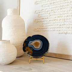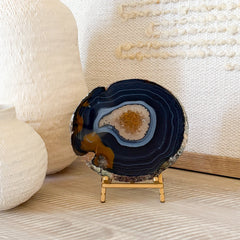 Unlock the Beauty of nature with this Brazilian Agate Druzy Slice. This piece is a true gemstone, formed over millions of years. With unique patterning and rich shades of blue and copper, this exquisite piece features an intricate crystal formation that shimmer with every glance. Agate is known for its calming and balancing effects, making it a great addition to any crystal collection or home decor. Bring a touch of nature and positive energy into your life with this beautiful agate slice.
