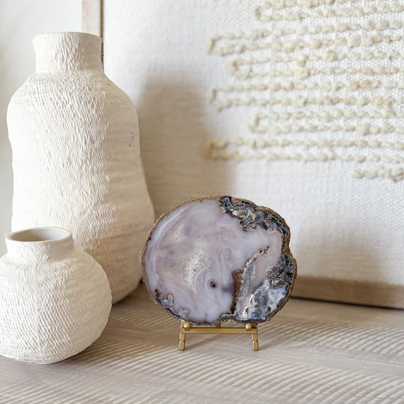 Slice is polished on both sides for two unique looks. Brass easel stand included.