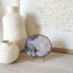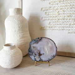 Our exquisite Brazilian Agate Slice is a stunning blend of nature’s artistry and sophisticated décor. Hand crafted in Brazil, this beautiful piece showcases moody shades of blue and grey and intricate patterning. Known for its grounding and calming properties, agate brings balance and positivity to any space. Bring the beauty of nature indoors with this striking agate slice.