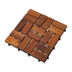 Add a visual appeal to your patio, backyard, or outdoor space with these teak wood interlocking tiles. Eighteen teak wood slats are set in a zig-zag basket weave pattern across each square tile for a sophisticated look. The non-slip premium oiled finish of these tiles lends a modern touch to indoor and outdoor spaces alike.