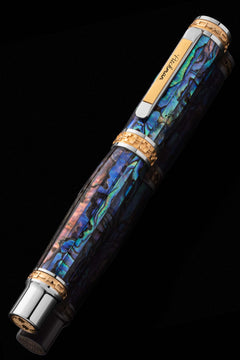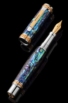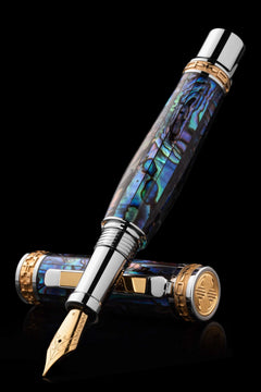 The barrel showcases the mesmerizing iridescence of Paua abalone shell, capturing light in a dance of shifting colors that evoke the depths of the ocean. This natural beauty is complemented by accents of gleaming palladium, offering a mirror-like finish that exudes sophistication. To elevate its opulence, 22-karat gold details are meticulously applied, creating a striking contrast against the cool brilliance of palladium and the luminous depths of abalone shell, adding a touch of regal elegance.