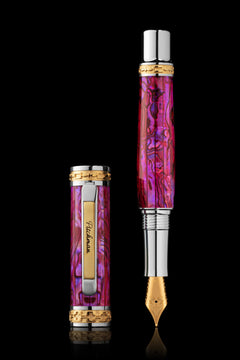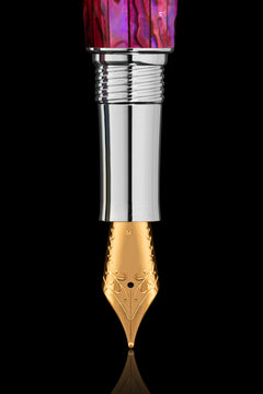 The barrel showcases the mesmerizing iridescence of Paua abalone shell, capturing light in a dance of shifting colors that evoke the depths of the ocean. This natural beauty is complemented by accents of gleaming palladium, offering a mirror-like finish that exudes sophistication. To elevate its opulence, 22-karat gold details are meticulously applied, creating a striking contrast against the cool brilliance of palladium and the luminous depths of abalone shell, adding a touch of regal elegance.