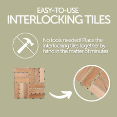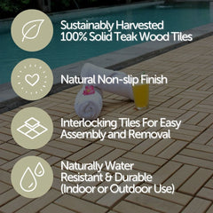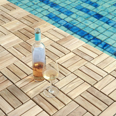 Bring a new modern look to your patio with our sleek teak wood interlocking tiles. Twelve teak wood slats are set in a basket weave pattern across the surface of each tile for a stylish visual interest. The non-slip finish of these tiles lends a modern touch to indoor and outdoor spaces alike.