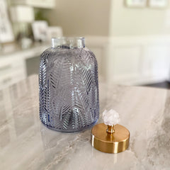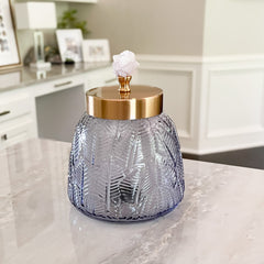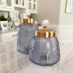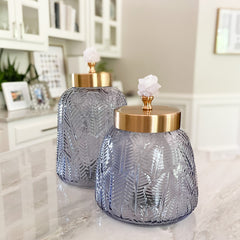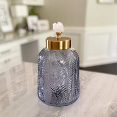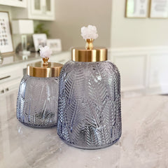 Introducing our Crystal Lidded Glass Canister - a stunning addition to any space! Made with textured blue-grey glass, these decorative canisters feature a brushed brass lid with a pale pink crystal handle, Hand crafted in Portugal, these striking canisters are the perfect way to add a pop of color to your countertop or bookshelf, showcasing a design that is truly one-of-a-kind.
