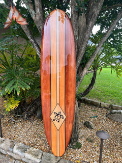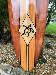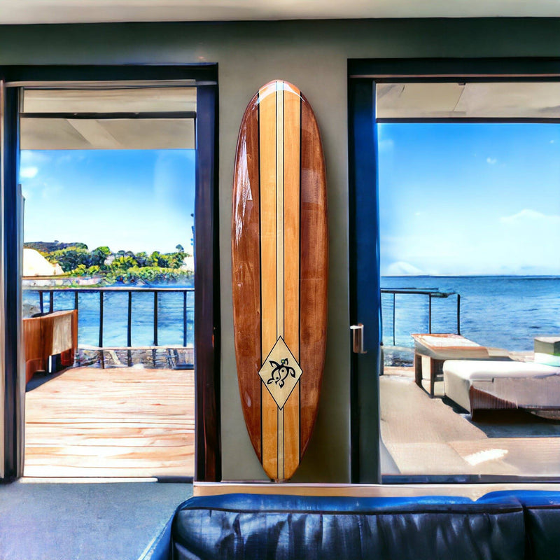 Wooden surfboard wall decor with rich wood tones, black pinstripes and turtle graphic