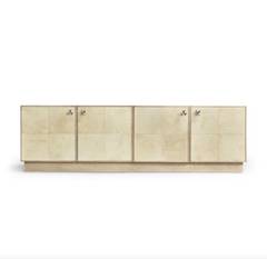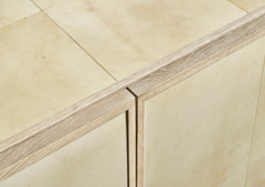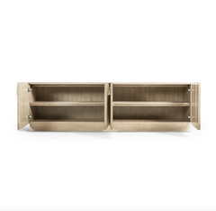 The Hydra Entertainment Console expertly blends modern design with superior craftsmanship. Constructed from oak solids and flat-cut random match oak veneers, it features genuine untreated parchment panels sealed for durability. Its oak-framed case and doors create a clean, structured silhouette, while four doors open to reveal two adjustable shelves for customizable storage. Accented with cast brass tassel door pulls finished to mimic wood and topped with an inset clear glass surface, this console offers both refined style and practical functionality for your media needs.