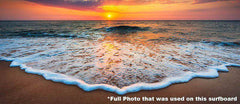 Coastal wall art deisgns with the Laguna Sunset Photo Series Surfboard is one of the latest additions to our product line. Featuring a stunning image of a sunset in Laguna Beach, California. This surfboards rails are painted a white to compliment the photo and is highlighted by a black pinstripe. This series allows customers to display their favorite photographs in an exciting new way.