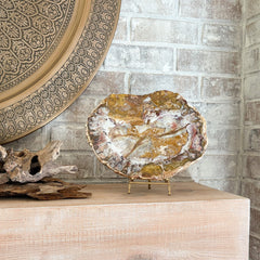 Slab is polished on both sides for two unique looks. Brass easel stand included.