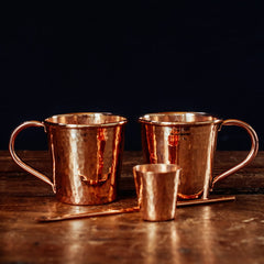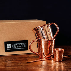This copper Moscow Mule gift set is an ideal gift for any Moscow Mule enthusiast. The set includes two copper-handled mule mugs, a two-ounce copper shot glass, a nine-inch bar spoon, and a Butler bell. Not only that, but it also comes with a pinstriped recycled paper gift box to make it that much more special. This set is perfect for entertaining or enjoying a Moscow Mule on a special occasion. Give the gift of tradition and style with this unique set.