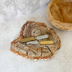 Our Natural Edge Petrified Wood Serving Board is perfect for displaying your culinary creations. Crafted from Indonesian petrified wood, this gorgeous piece adds a rustic touch to any kitchen. Its naturally unique surface is a perfect backdrop for your favorite charcuterie.