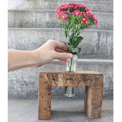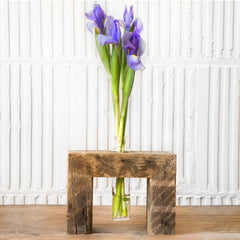 This unique vase transforms a single stem into a beautiful statement piece. It's the perfect addition for any modern farmhouse or rustic wedding. We hand-make each wooden stand from century old 2x4's salvaged from demolition homes around Chicago, IL. The glass bud vase simply slides in through the top, allowing one to easily clean the glass when necessary. We custom designed the bottle to be the perfect stem vase. The 6" length, slight taper and small neck allow more water storage while holding the stems in an upright position.