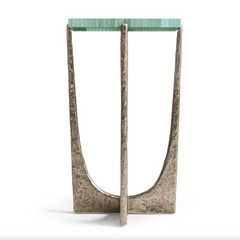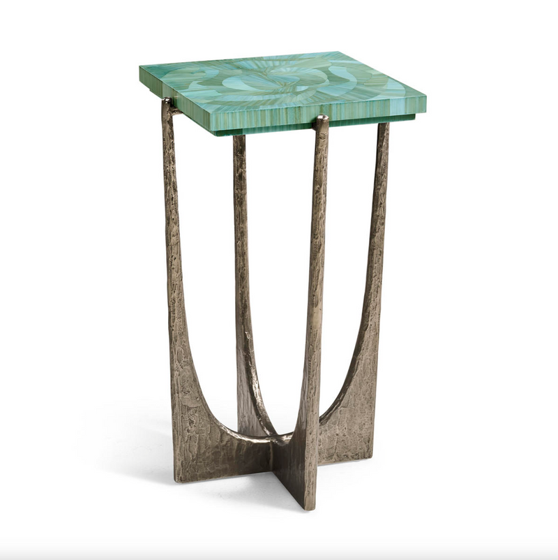 The Sea Glass Martini Table showcases expert craftsmanship with its 14-inch square top featuring hand-applied straw marquetry in soothing blue tones, evoking the movement of ocean waves. Its lacquered finish ensures durability while highlighting the intricate design. The textured, curved base crafted from wax-cast stainless steel complements the tabletop’s artistry, making this piece a refined addition to any coastal-inspired space.