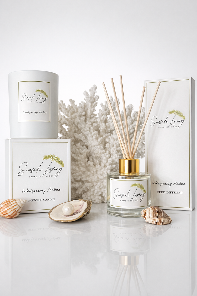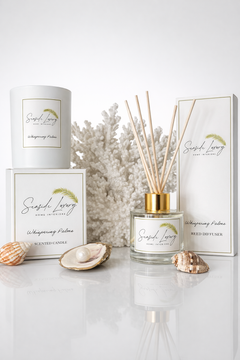 Our Whispering Palms candle is thoughtfully crafted to provide a clean, even burn for up to 80 hours, filling your space with long-lasting coastal tranquility. Paired with our 100 mL reed diffuser, this collection allows you to enjoy a continuous, effortless fragrance that brings a sense of calm, warmth, and seaside elegance into any room.