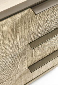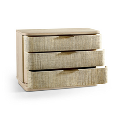 The Seiche Large Grasscloth Nightstand combines expert craftsmanship with refined design, featuring three bleached oak drawers wrapped in textured grasscloth. Custom cast hardware blends diverse materials, enhancing its organic flow and sculptural presence. This nightstand elevates any interior with its sophisticated lines and tactile appeal, offering both functional storage and a statement of elegant artistry.