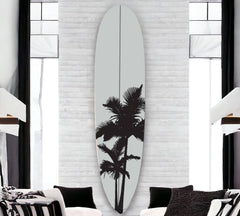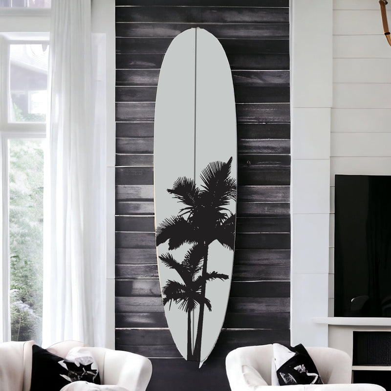 Modern black and white decorative surfboard with black palm tree silhouette and grey pinstripe down center.