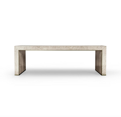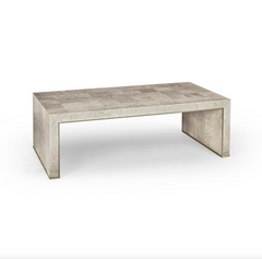 The Skookumchuck Madrona Burl Cocktail Table from Jonathan Charles’ Water portfolio showcases exceptional craftsmanship with its butcher block top and sides crafted from striking Madrona burl slabs in a sophisticated smoke gray finish. Satin white brass accents along the base and ridges provide a refined contrast, enhancing its contemporary appeal. This table’s distinctive design and robust form make it a compelling centerpiece, perfect for elevating modern interiors with both elegance and character.