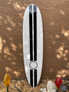 Modern all white surfboard deck with black stripes, toward the tail is a circle perfect for you initials or graphic. Inspired design by Chanel Surfboard Art. Free personalization. Add up to 3 letters within circle. We can also add your graphic or logo. Please email us with your request prior to ordering.