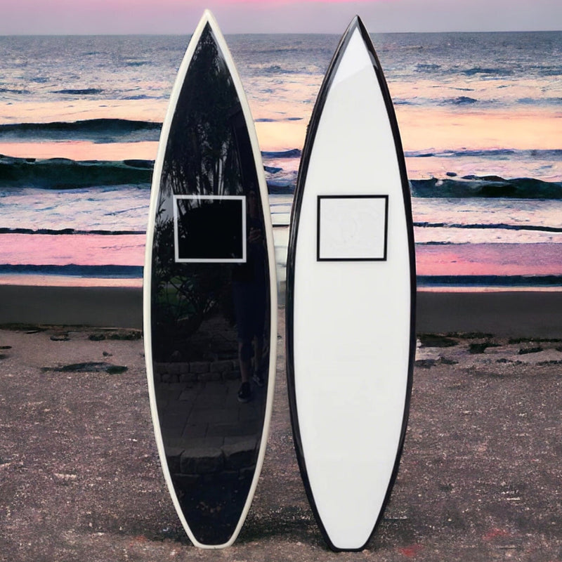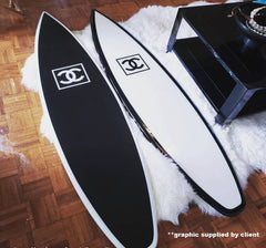 Beautiful modern white or black surfboard decor with reverse colored rail and pinstripe. Inspired by high fashion modern black and white Chanel art. Includes 3 letter personalization. We can also add your graphic or logo. Please email us with your request prior to ordering.