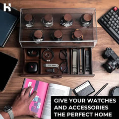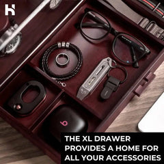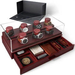 With the innovative two-tier platform, you can now organize and display 7 watches in our collectors watch box. The smooth running drawer contains 6 compartments for all of your accessories, including your watch straps / bands, AirPods, wallet, coins, cards, hopes and dreams.