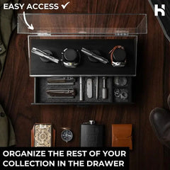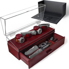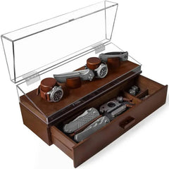 This pocket knife and watch holder organizer for men is practical and visually appealing, with a drawer to store additional watches or knives.