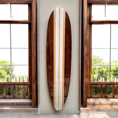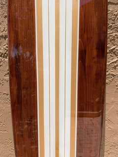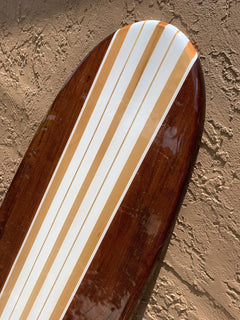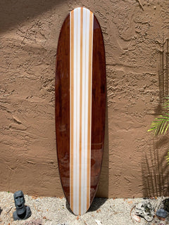 This wood surf board, inspired by a piece of driftwood I found at my local jetty. A great color combo white center stringers and rich chestnut stained rails. All highlighted with white pinstripes.