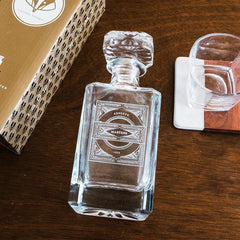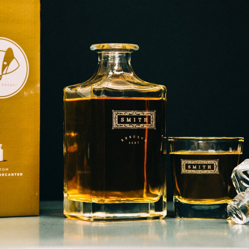 This personalized liquor decanter is topped with a square glass stopper. Unlike many lightweight glass decanters you’ll find, this guy has a heavy, solid base and weighs in at almost 3lbs. It will also hold 28oz (850ml) of his finest malted beverage. Each glass holds 250ml.