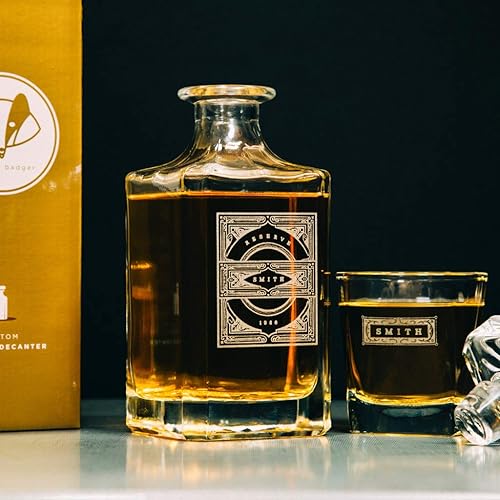 This personalized liquor decanter is topped with a square glass stopper. Unlike many lightweight glass decanters you’ll find, this guy has a heavy, solid base and weighs in at almost 3lbs. It will also hold 28oz (850ml) of his finest malted beverage. Each glass holds 250ml.