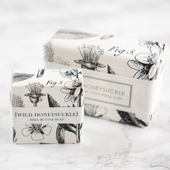 SIZE/DESCRIPTION: 6+oz. Wild Honeysuckle shea butter bath bar packaged in our signature botanical and vintage illustrations.